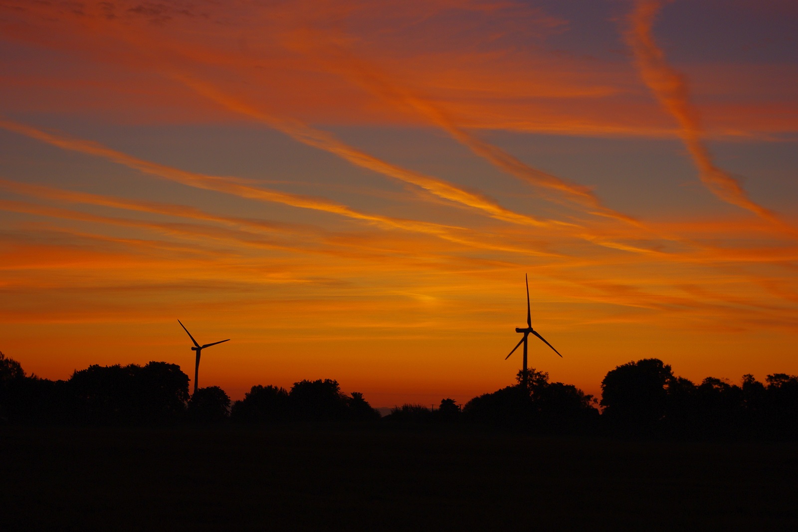 Wind turbines silhouetted by a red-striped sky at sunrise